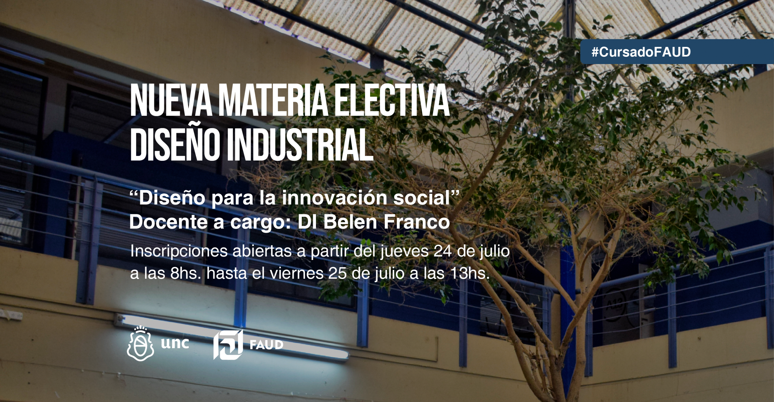 Secretaría Académica informa que desde el jueves 24 de julio a las 8 hs. hasta el viernes 25 de julio a las 13 hs., estarán disponibles las inscripciones a través de sistema Guaraní para el cursado de la materia electiva de Diseño Industrial: «Diseño para la innovación social»