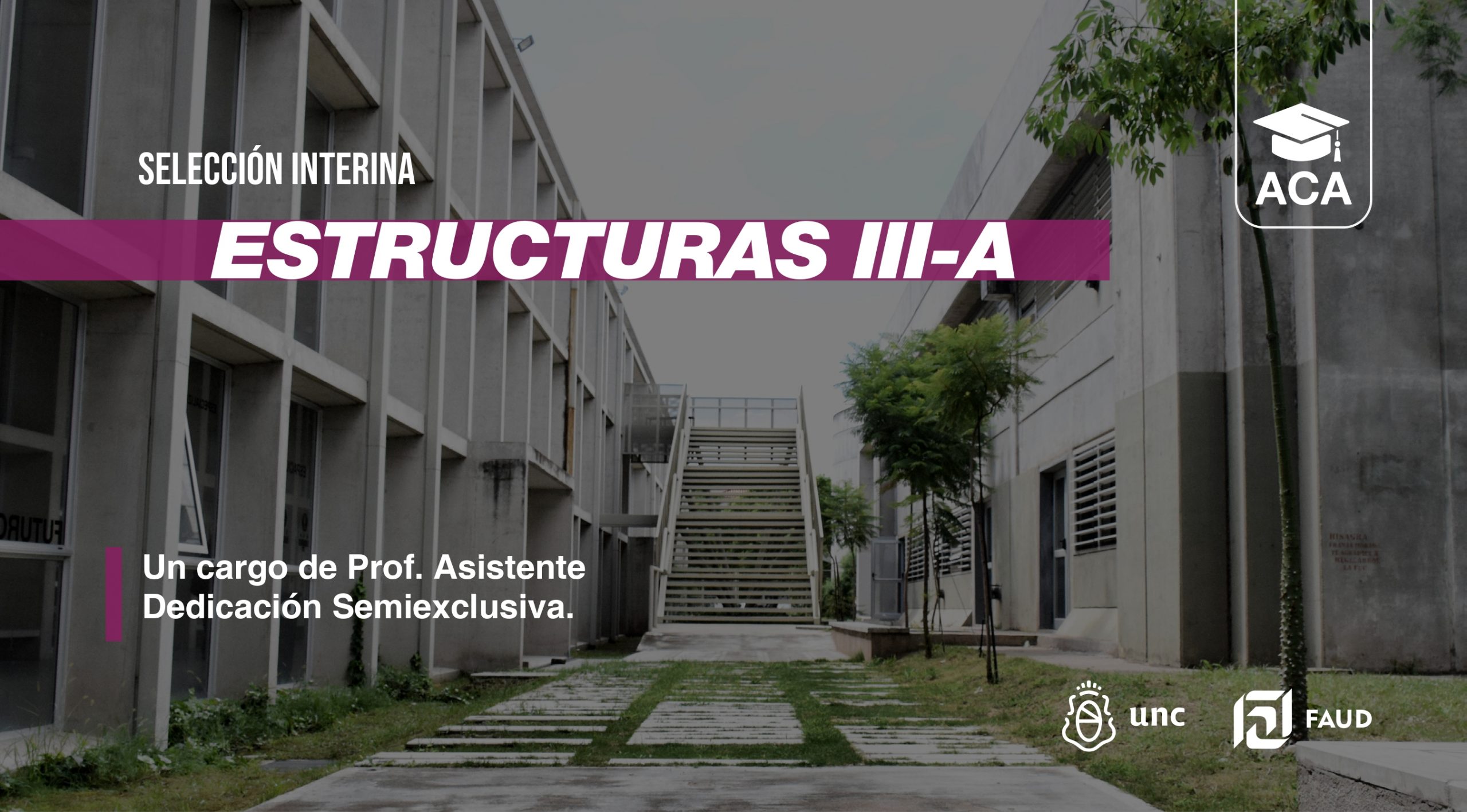 La Secretaría Académica informa que se encuentra abierta la convocatoria para la selección interina de un cargo de PROFESOR/A ASISTENTE Dedicación Semiexclusiva para la cátedra de ESTRUCTURAS III-A.