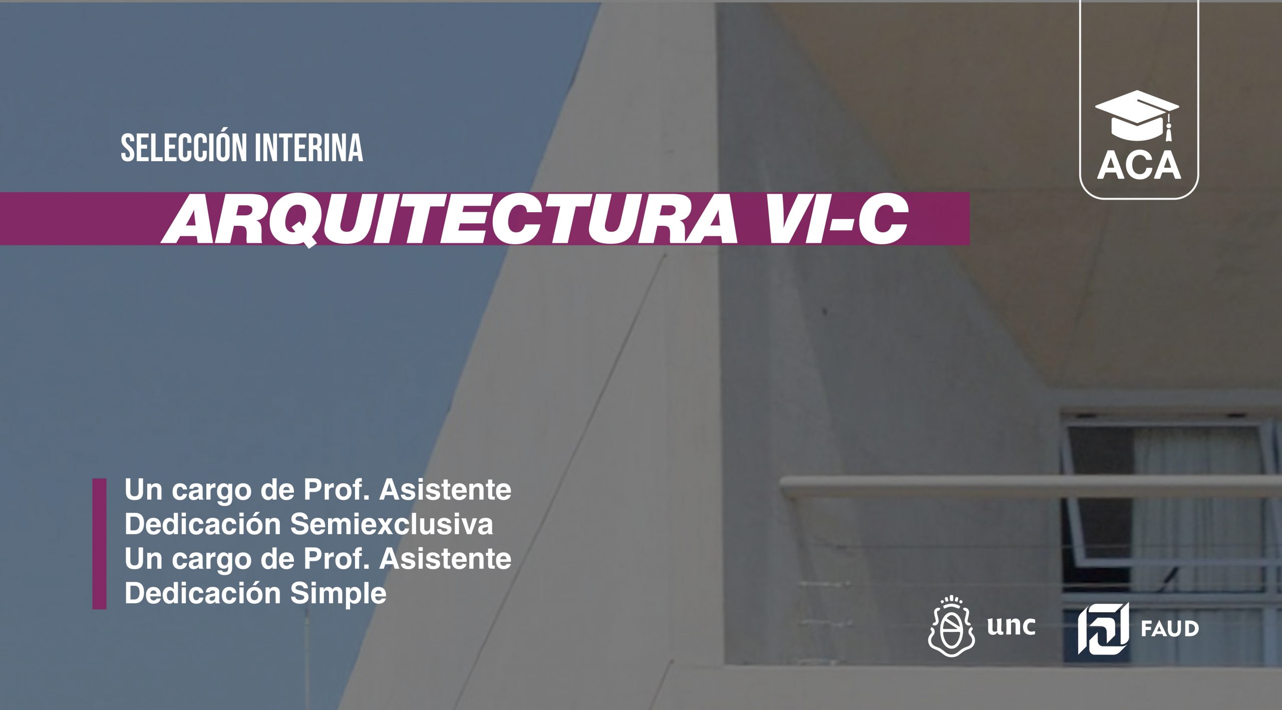 La Secretaría Académica informa que se encuentra abierta la convocatoria para la selección interina de un cargo de PROFESOR/A ASISTENTE D.Semiexclusiva y un cargo de PROFESOR/A ASISTENTE D.Simple para la cátedra de ARQUITECTURA VI-C.