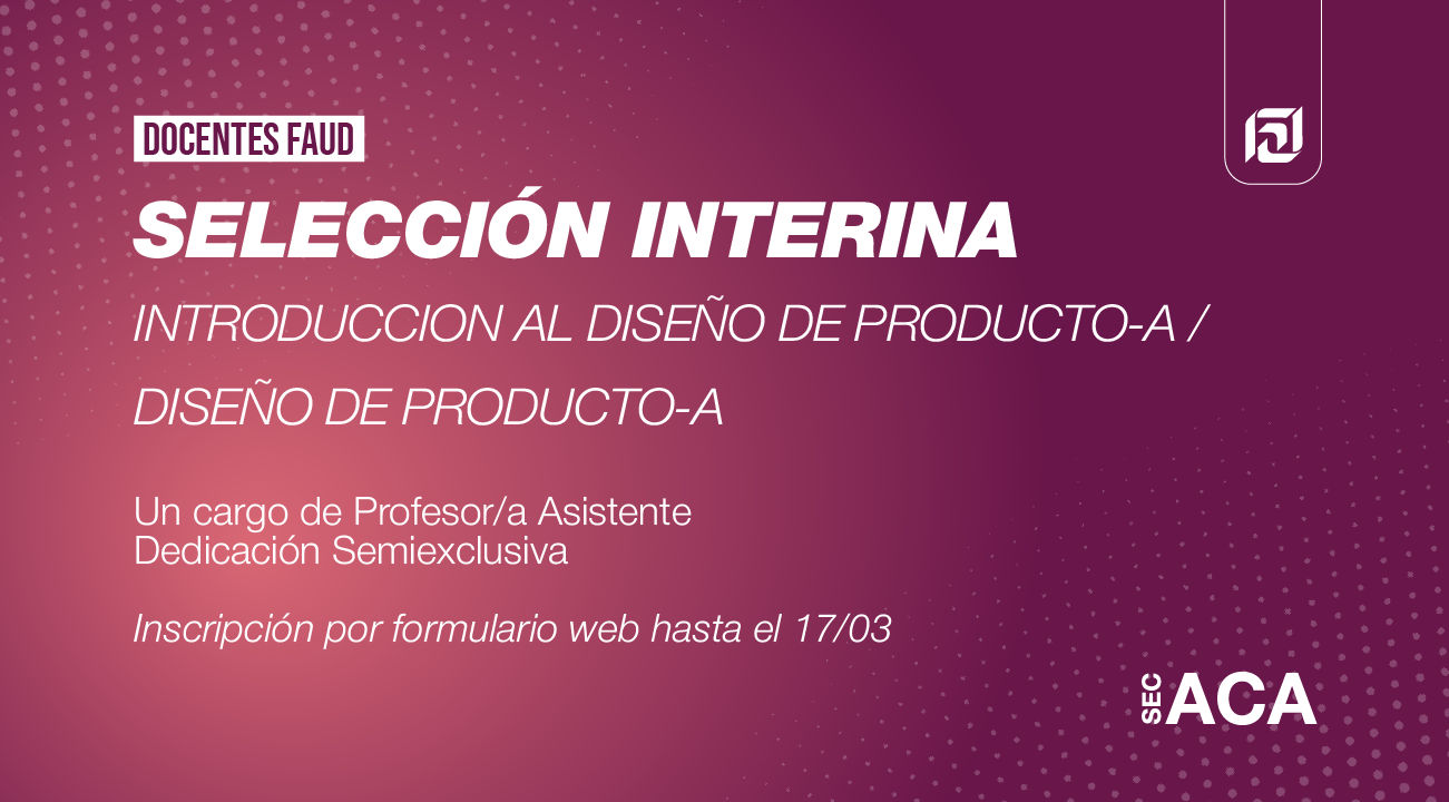 La Secretaría Académica informa que se encuentra abierta la convocatoria para la selección interina de un cargo de PROFESOR/A ASISTENTE D.S.E. para la cátedra de INTRODUCCION AL DISEÑO DE PRODUCTO-A / DISEÑO DE PRODUCTO-A de la carrera de Diseño Industrial.
