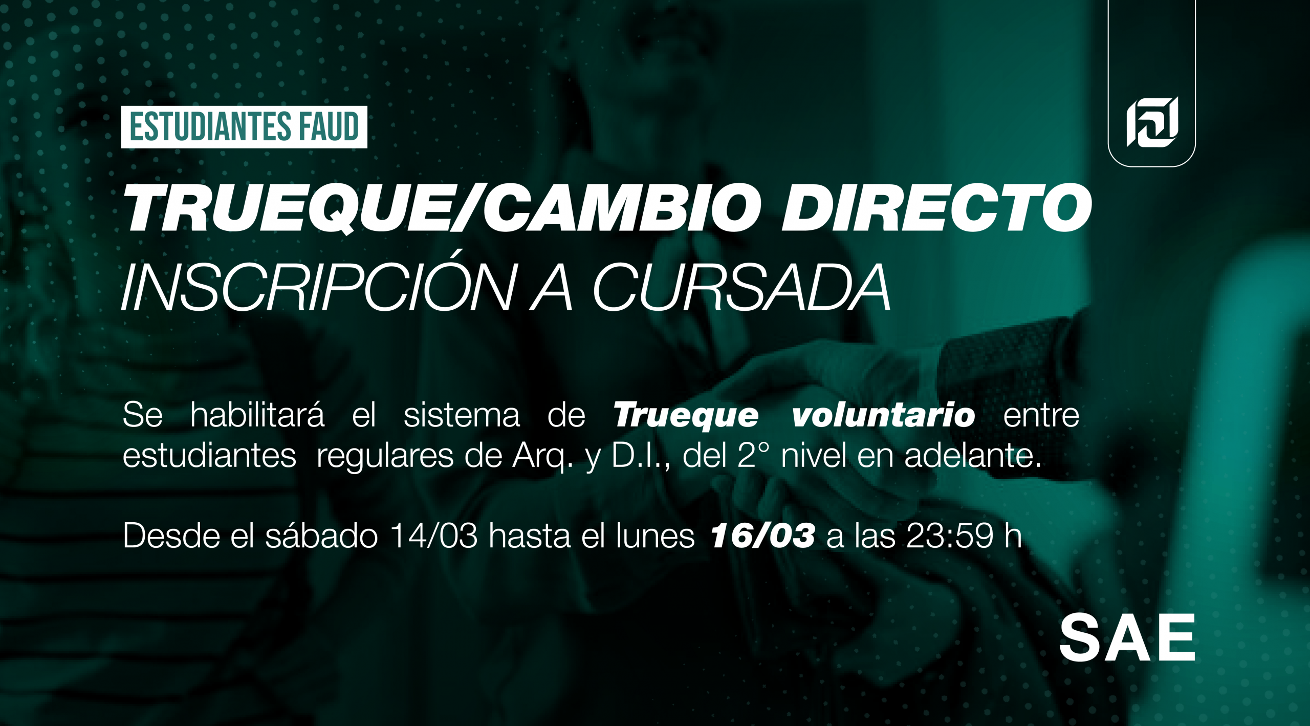 La Secretaría de Articulación Estudiantil informa que se encuentra habilitado el trámite de Cambio Directo / Trueque 2026, de acuerdo con lo establecido en el ANEXO CAMBIO DIRECTO / TRUEQUE FAUD aprobado por la RHCD‑2025‑156‑UNC‑DEC#FAUD.